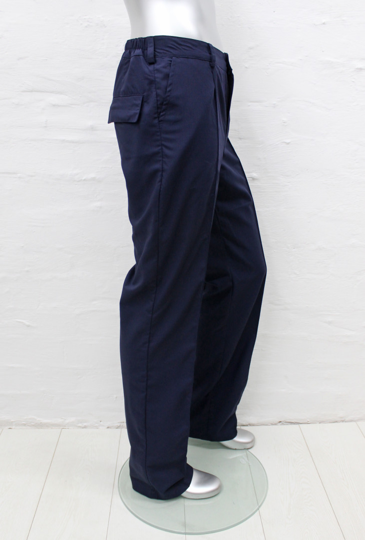 Пояс с широкими шлевками и вшитой резинкой, регулирующей объем талии. Имеются два врезных кармана по бокам, и один задний на липучках. На передней части брюк фиксированные стрелки по длине брюк.