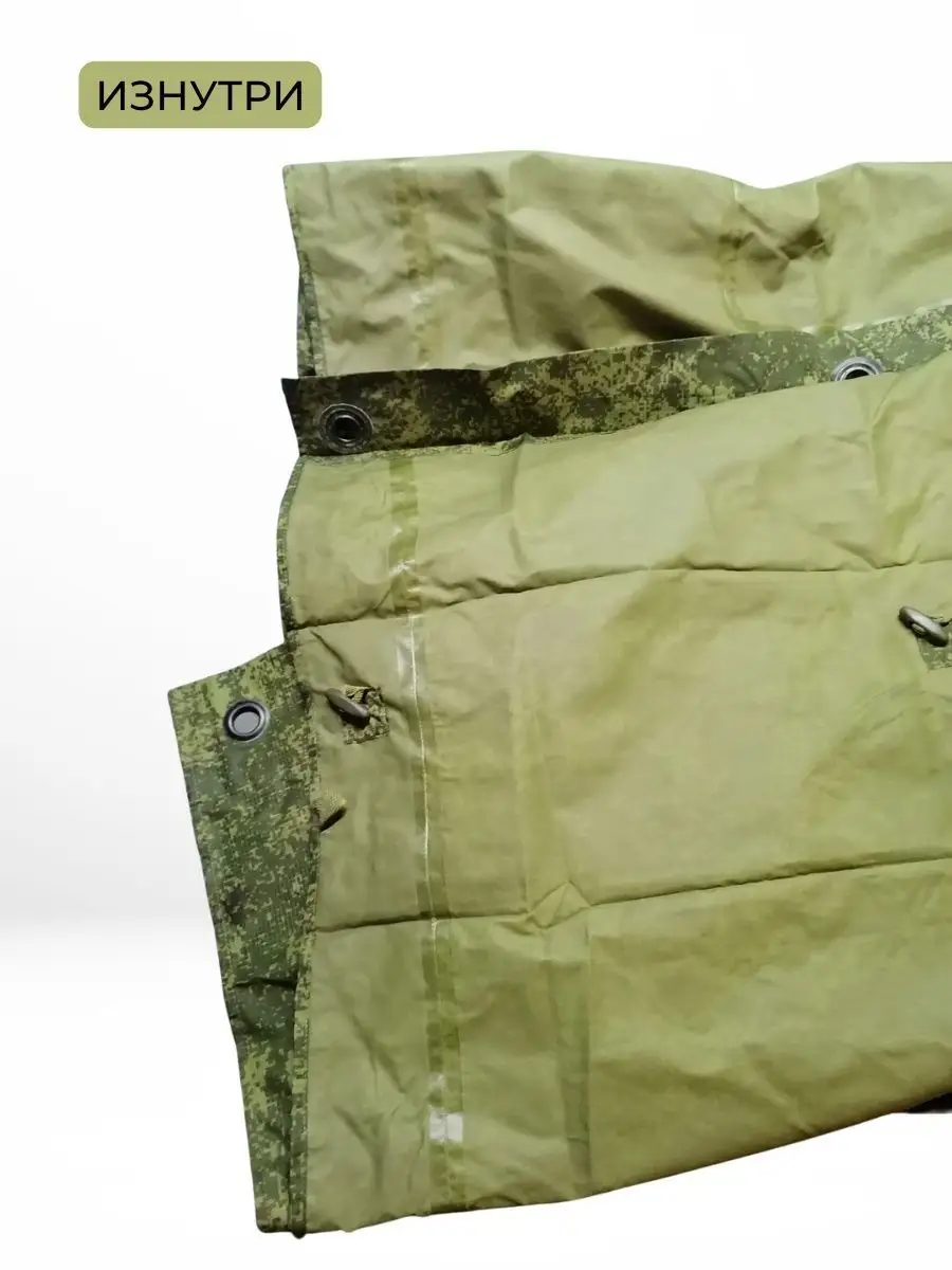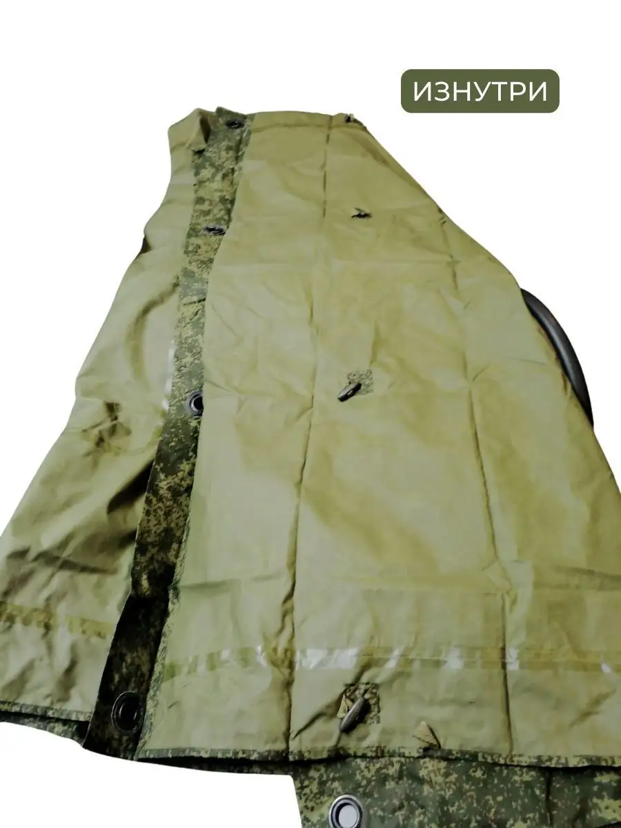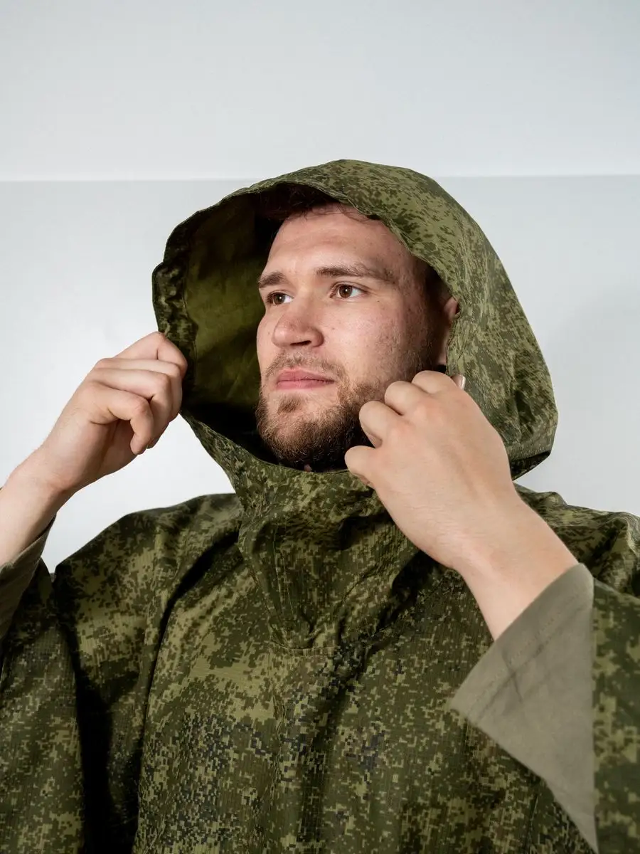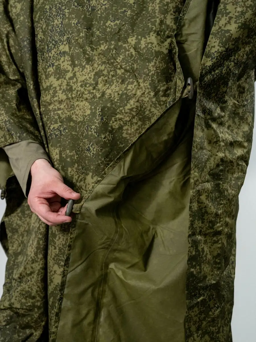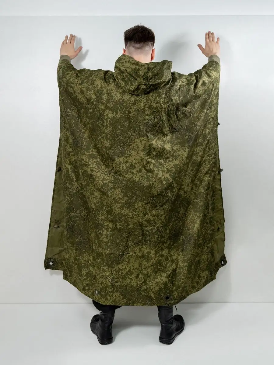 Плащ-палатка накидка специальная или армейский дождевик пончо Спецназа СпН (подразделения специального назначения). Изготовлена из капроновой ткани с полиуретановым покрытием камуфлированной расцветки. Выполнена из целого полотнища, в середине которого расположен капюшон. Швы проклеены и абсолютно герметичны. По периметру установлены люверсы и застёжки, позволяющие использовать её как тент или соединять несколько изделий вместе. На внутренней стороне спереди, располагается большой карман, в него путем обратной выворотки (удобная конструкция хранения сама-в-себе) и складывается плащ палатка после использования, закрываясь на вшитую молнию. В сложенном виде размер около 50х24см. Обычно используется как классическое пончо, или при застегивании рукавов превращается в плащ накидку (формируются рукава). Легко вмещает не только человека любого роста и веса (она всеразмерная, под все росты и габариты), но также заодно вместит и защитит от ветра и любого дождя большой рейдовый рюкзак на спине, и оружие в руках. Капюшон утягивается веревочной затяжкой с пластиковым фиксатором и регулируется как под размеры головы, так и под любые головные уборы, шлемы. При этом легко обеспечивается не ограниченная подвижность и высокая удобность применения. Военный дождевик отлично подходит для армейских войск и горных бригад специального назначения СпН спецназа, но также для туристов, страйкболистов, любителей охоты и рыбалки. Очень нравится эта накидка также грибникам и автомобилистам на случай поломки во время дождя. Плащ уникальный и многофункциональный элемент армейской экипировки, его можно использовать как: тент, козырьки, укрытия шалашей и открытых окопов, подстилка, прикрываются входы в землянки и шалаши, палатка, плащ-дождевик. Военная плащ палатка может послужить реквизитом на фото сессиях, исторических реконструкциях, для съемок исторического кино или боевиках и сериалов, а так же в театральных постановках.