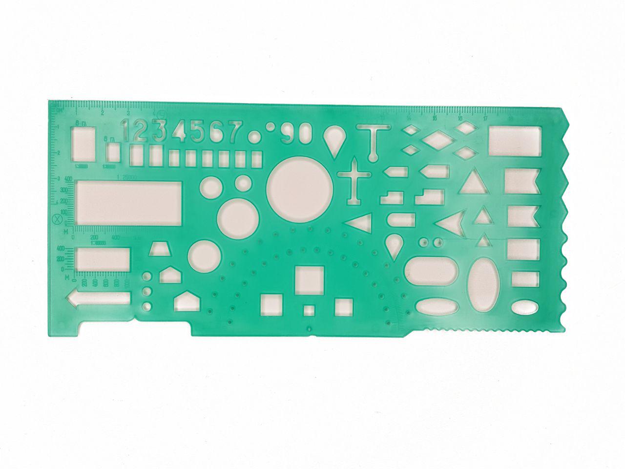 Офицерская линейка советских времен, не теряет форму. Линейка по ГОСТу имеет более 50-ти тактических знаков. Такие линейки созданы для офицеров специально работать на картах или других топографических документах. Это прозрачная пластина(прямоугольник) с трафаретами, по центру с транспортирной шкалой и делениями до 20см. Удобно наносить условные знаки на документы. Так же широко используют в офисах, в школах и личных целях.