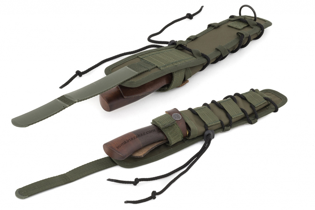 Изделие выполнено из современного износостойкого материала в сочетании с качественной фурнитурой. Предназначен для фиксации зачехлённого ножа. Крепится на молли систему. Снизу на чехле вшито полукольцо для дополнительной фиксации. Можно крепить на ремень. Утягивается шнуром со стопором.